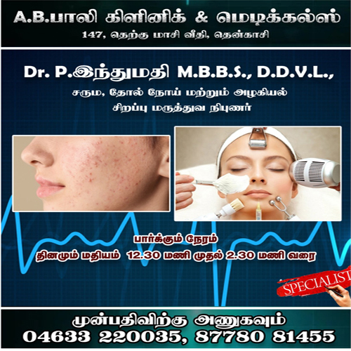 ORTHOS SPECIALIST Dr.P.VedhaMurthy, M.B.B.S., D.Ortho., Dr.V.Srimanikandan, M.B.B.S., D.Ortho., Visiting Hours: Morning 9.30 am Evening 3.00Pm, Evening 3.30pm to Night 9.00Pm ENT SPECIALIST Dr.Brindhavani Baskaran, M.S., ENT Visiting Hours: Second & Fourth Sunday (Morning 10.00 am to Afternoon12.00Pm) SKIn SPECIALIST DR.P.Indhumathi, M.B.B.S., D.D.V.L., Skin Doctor Visiting Hours: Afternoon 12.30pm to 2.30pm