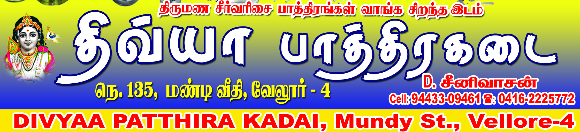 Address : No.135, Mundy Street, Vellore, Tamilnadu, Pincode : 632004