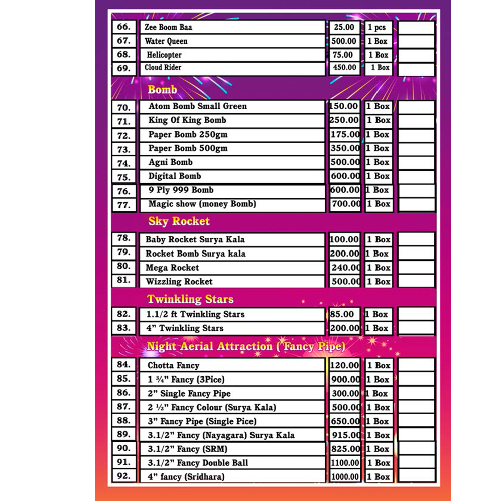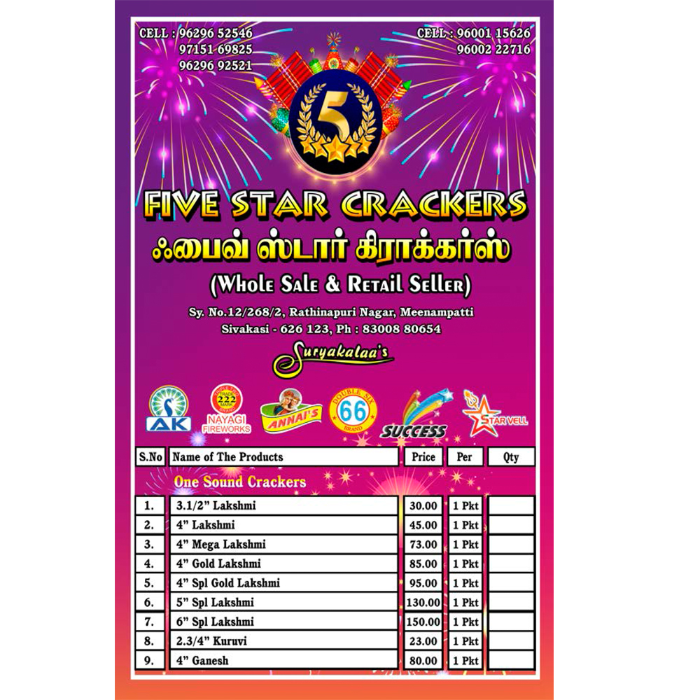 Five Star Crackers in Virudhunagar HO, Virudhunagar Five Star Crackers in Virudhunagar is one of the leading businesses in the Fire Cracker Wholesalers. Also known for Fire Cracker Wholesalers, Fire Cracker Dealers, Fire Cracker Distributors, Fire Cracker Dealers-Annies, Green Fire Cracker Dealers and much more. Find Address, Contact Number, Reviews & Ratings, Photos, Maps of Five Star Crackers, Virudhunagar