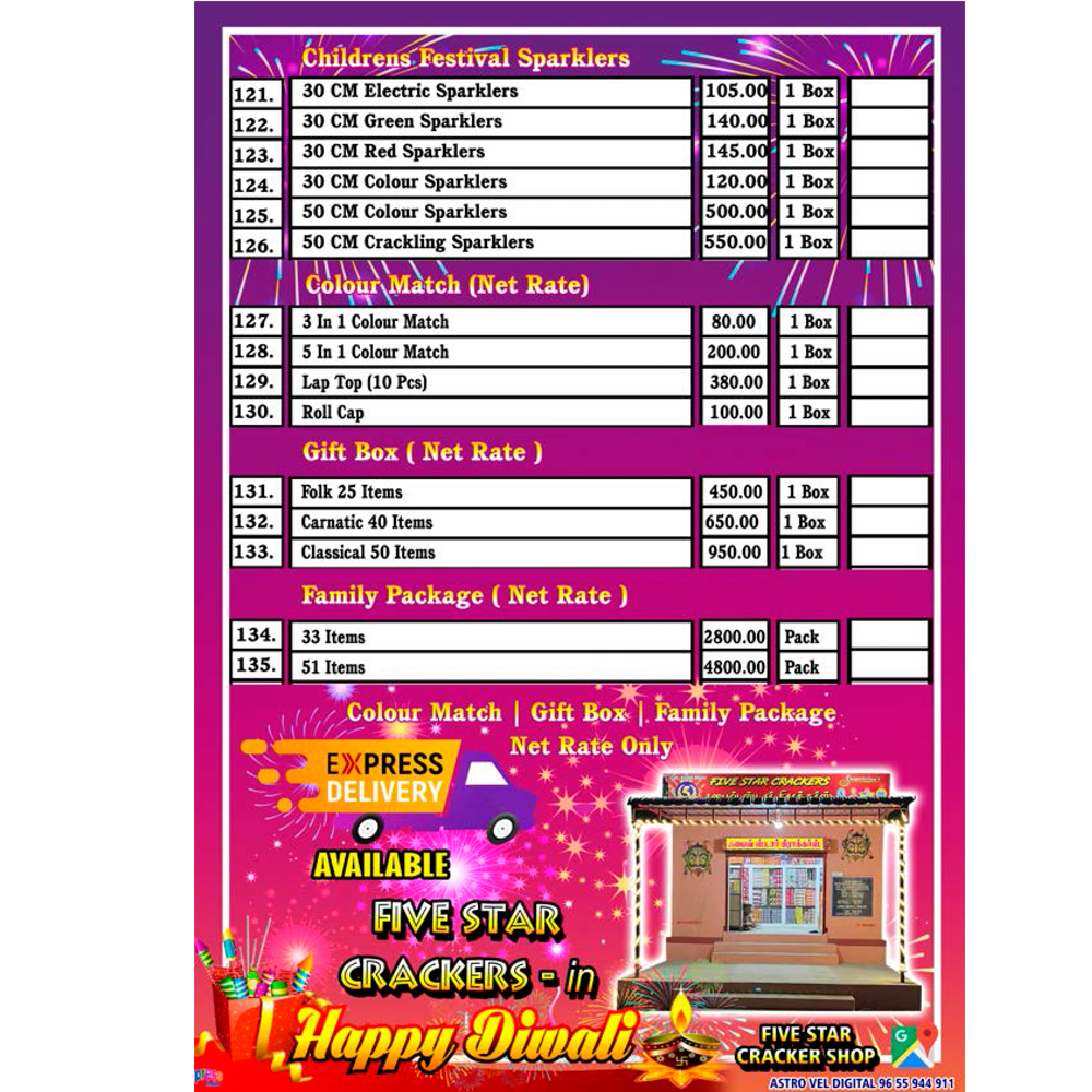 Products and Services offered: Five Star Crackers in Virudhunagar HO has a wide range of products and / or services to cater to the varied requirements of their customers. The staff at this establishment are courteous and prompt at providing any assistance. They readily answer any queries or questions that you may have. Pay for the product or service with ease by using any of the available modes of payment, such as G Pay. This establishment is functional from Open 24 Hrs - Open 24 Hrs.