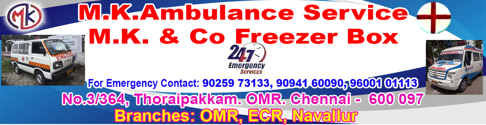 M k & CO AMBULANCE IS AVAILABLE FROM TO HELP YOU FOR ANY MEDICAL NEED.YOU CAN ALSO GET IN TOUCH WITH THEM TO CHECK IF THEY PROVIDE 24/7 SERVICES.