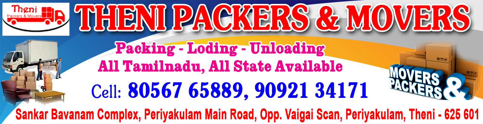 Theni Packers & Movers in Periyakulam Main Road, Theni is a reliable name in the industry as they aim to deliver the best experience to their customers. This has helped them build up a loyal customer base. They started their journey in 2009 and ever since, they have ensured that the customer remains at the centre of their business operations and philosophy. As they are located in a favourable neighbourhood, exactly at Sankar Bavanam Complex, Opposite Vaigai Scan, Periyakulam Main Road, Periyakulam-625601 near Opposite Vaigai Scan , it is easy to locate Theni Packers & Movers on the map. For any kind of assistance or questions, it is best to contact them directly during their business hours.Also listed in Packers And Movers, Packers And Movers (All India), Packers And Movers (Within City), Packers And Movers For Household Item, 24 Hours Packers And Movers etc.they accept multiple modes of payment such as Cash, Master Card, Visa Card, Debit Cards, Cheques, American Express Card, Credit Card. The best time to contact them is anytime between 00:00 - 23:59.