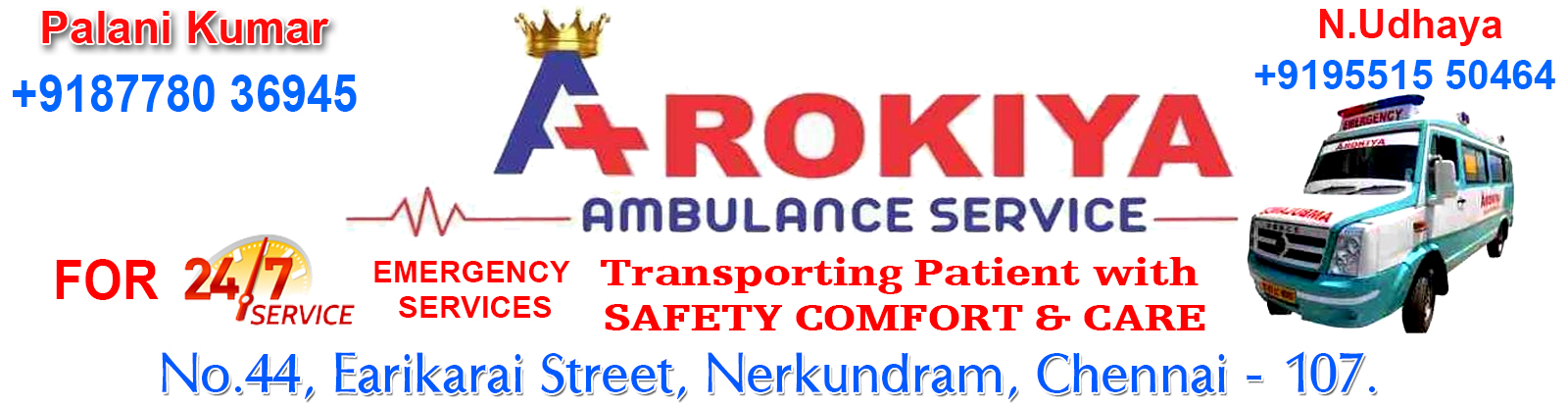 Arokiya Ambulance Service got established in the year of 2021 by Mr. Palani Kumar, located at Nerkundram Chennai. We provide rescue services through our Ambulance to ensure that the patients are safe enough to reach the hospital quickly. Our Ambulance drivers are completely professional who have more than 10 years of experience in handling ambulance services.We cater all over Chennai for ambulance and also we supply freezer box.