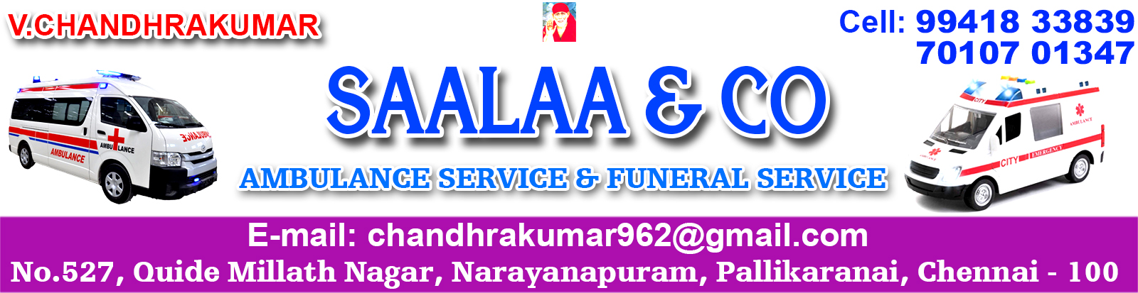 Saalaa & Co Ambulance Service Funeral Service Freezer Box Rent in Chennai is one of the leading businesses in the Hearse Services. Also known for Ambulance Services, Dead Body Freezer Box On Rent, Mortuary Vans On Hire, Undertakers, Hearse Services, Funeral Bands, Dead Body Freezer Box Ambulance Services, Oxygen System Ambulance Services and much more.Saalaa & Co Ambulance Service Funeral Service Freezer Box Rent in Pallikaranai has a wide range of products and / or services to cater to the varied requirements of their customers. The staff at this establishment are courteous and prompt at providing any assistance. They readily answer any queries or questions that you may have. Pay for the product or service with ease by using any of the available modes of payment, such as Cash, Cheques. This establishment is functional from 00:00 - 23:59.
