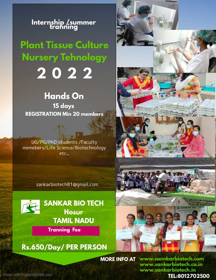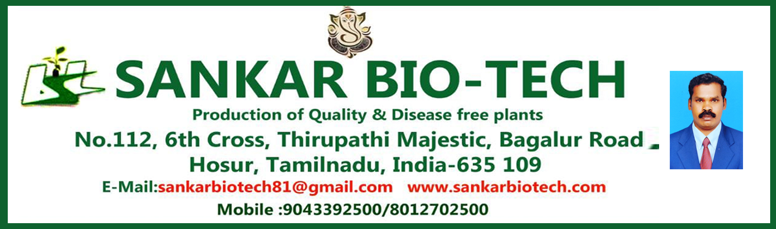 Our company, Sankar Bio-Tech was commenced in the year 2011 with an aim to offer optimum quality products to our esteemed customers. We are a Sole Proprietorship based venture and operate all our business tasks from our head office located at Hosur, Tamil Nadu(India). We are instrumental in mass culturing of all kind of plants in aseptic condition and trading a wide range of products such as Banana(G9, Red, yelakii , Udhyam, and Nendhran) spathipillam Plant, Anthurium Plant, Xanadu Plant banana karpuravalli, Tissue culture teak plant (Burma teak)