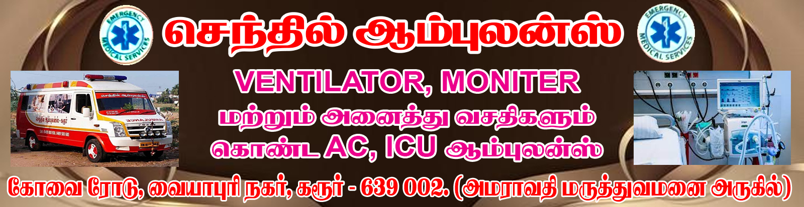 We, Karur Senthil Ambulance, situated at Karur, Tamil Nadu is a reputed and committed ambulance providers. We are committed to provide excellent & critical care service in emergencies. We are recognized for our passionate care, we take to improve standard in critical care transport as well as safe and careful assistant in non emergency situation. We feel honored and privileged that our pre-existing clients have positive feedback towards us.